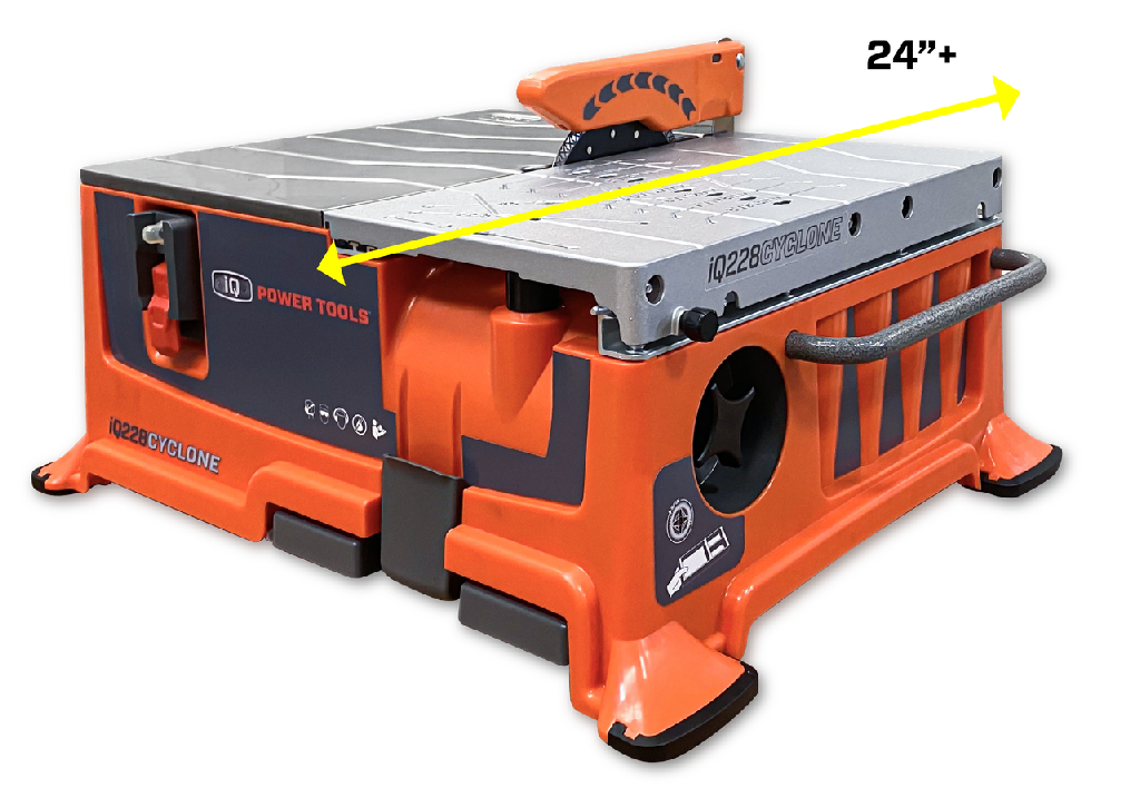 Introducing the iQ228CYCLONE™, the world’s first 180MM dry cut tabletop tile saw with integrated dust control and new TRU-CUT™ System. Designed for professional contractors to eliminate the problems with cutting wet, save time, and increase your profitability on tile jobs. The TRU-CUT™ System is an integrated measurement system that provides consistent and accurate cuts for any job. System includes: iQ Micro Fence & pre-measured Rolling Table.