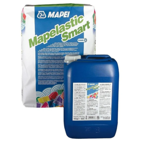 Two-component, high flexibility cementitious mortar, for waterproofing concrete surfaces, balconies, terraces, basins, and swimming pools. Can be applied by brush or with a roller. APPLICATIONS: Mapelastic Smart is used to form highly flexible, waterproof, and protective dressings on concrete structures, even those subject to cracking. It may be applied on cementitious screeds, existing floors (clean and well bonded to the substrate) and renders to waterproof bathrooms, showers, balconies, terraces, and swimming pools before laying ceramic and natural stone. The mortar is applied by brush or with a roller on surfaces that must be perfectly clean and sound. Apply thickness of at least 2 mm and embed the Fibreglass Mesh or Mapetex Sel. Avoid the Mapelastic Smart membrane come into contact with water for 24 hours after laying. Wait at least 5 days before laying ceramic tiles.