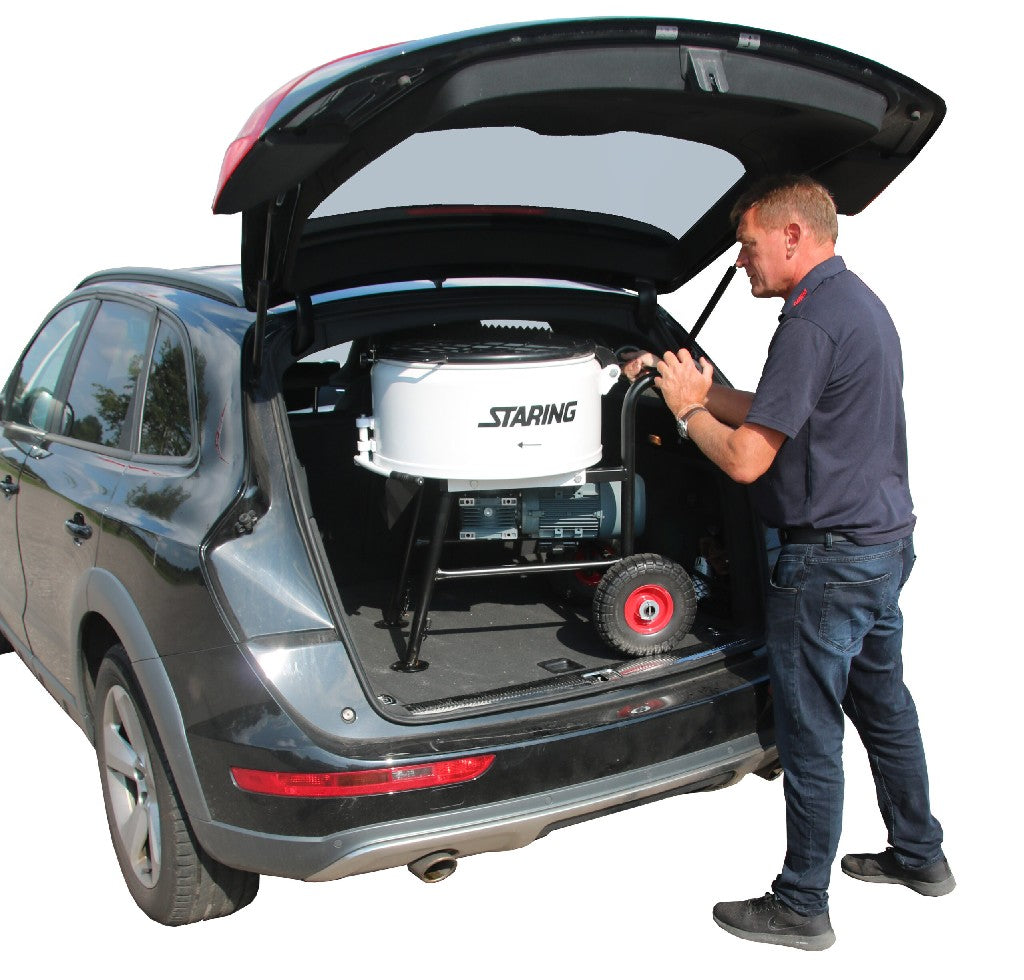 The blades can be adjusted individually. The design of the STARING STB-65 makes the mixer easy to operate for one person. Likewise, the mixer can be lowered for transportation in a large “station wagon.”